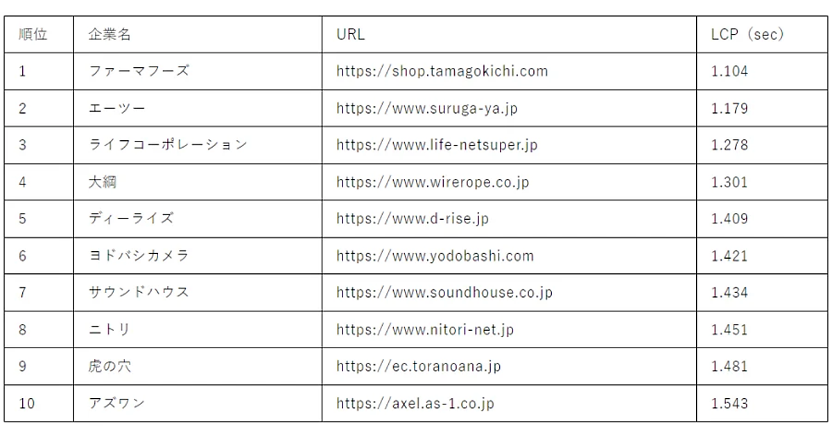 国内ECサイトにおける表示速度ランキングの1位は「ファーマフーズ」で、LCPは1.104秒。2位は「エーツー」で1.179秒、3位は「ライフコーポレーション」で1.278秒と続いた。なお、GoogleではLCPの基準値を定めており、ページの読み込み開始から2.5秒以内に表示されれば、ユーザー体験は良好であるとしている。