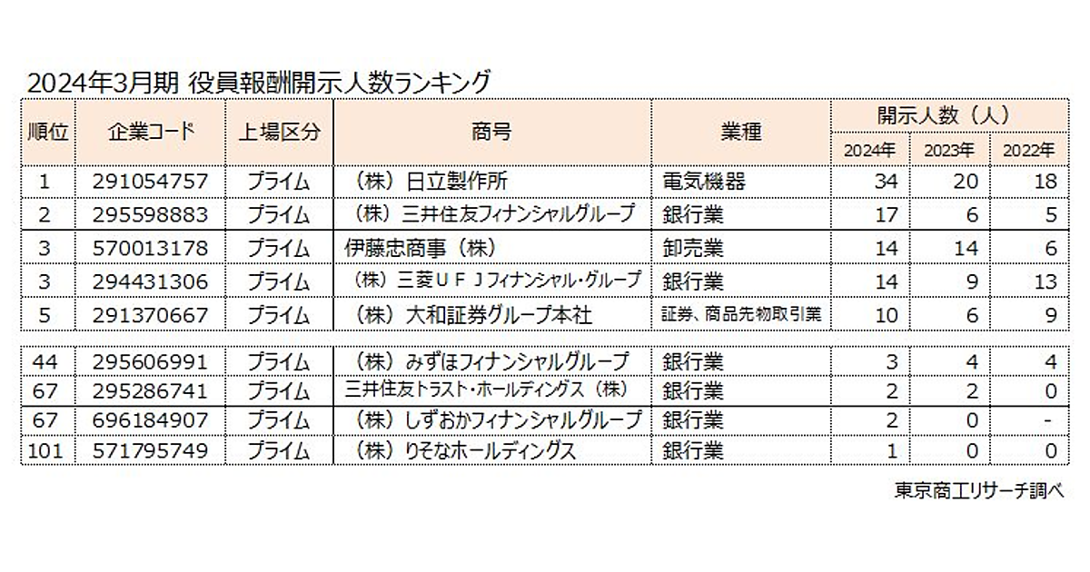 開示人数が最も多かったのは「日立製作所」の34人で、開示制度の開始以降(2010年3月期)で最多人数を記録した。以下、「三井住友フィナンシャルグループ」が17人、「伊藤忠商事」と「三菱UFJフィナンシャル・グループ」が14人で同率となった。