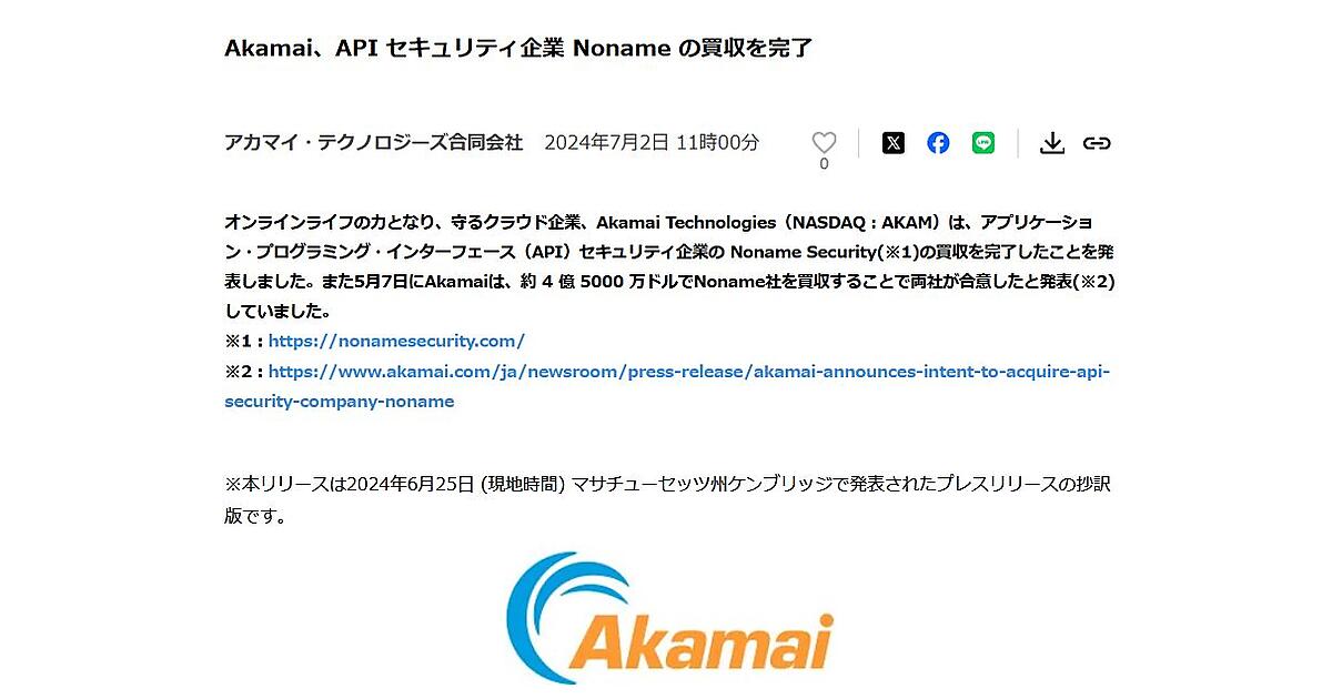 クラウドプラットフォーム事業の米国Akamai Technologiesは、アプリケーション・プログラミング・インターフェース(API)セキュリティ企業の米国Noname Securityの買収を完了したと6月25日(現地時間)に発表し、日本法人のアカマイ・テクノロジーズが7月2日に日本語抄訳を公表した。Akamaiは5月7日に約4億5000万ドル(約726億円)でNonameを買収することに両社が合意したと発表していた。