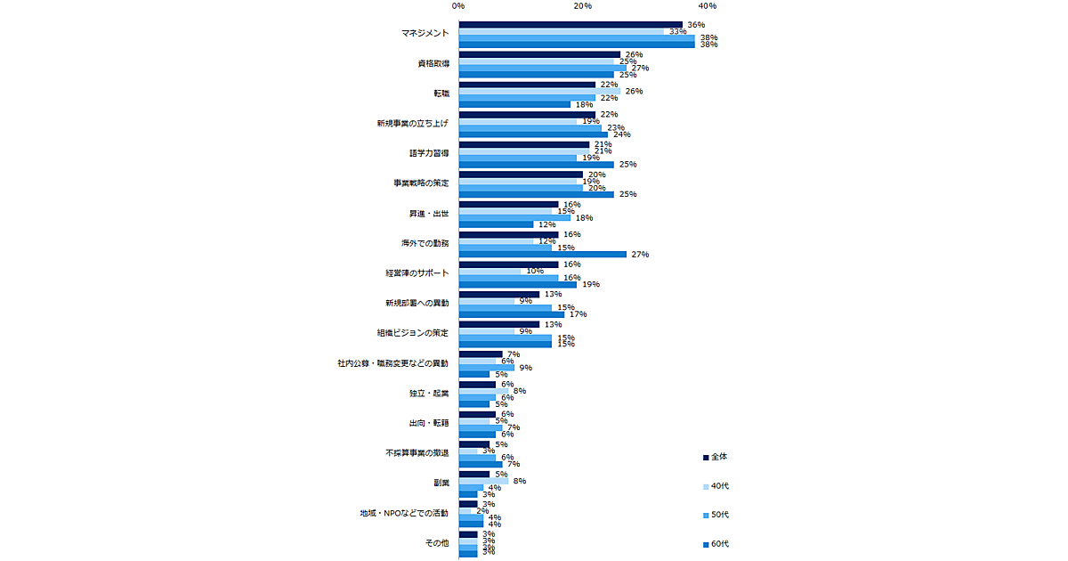 続いて、30代のうちにやってよかったことを聞くと、「マネジメント」が36%、「資格取得」が26%、「転職」が22%でトップ3となった。30代でマネジメントを経験すると、転職後のポジションに有利に働くという意見も見られた。