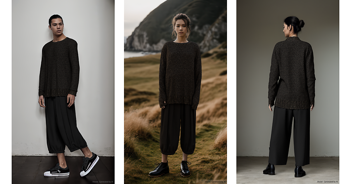 多様なサイズ・体形のAIモデルを用いたビジュアルコンテンツを短時間で自動生成し、3Dシミュレーション技術でサイズ・体形の違いに応じた着丈を高精度で再現。3D衣服データとAIモデル画像だけで着用イメージ画像の生成が可能で、制作工数を大幅に削減する。AIモデル画像は意図せず類似性が生じることを回避するべく、顔変更処理など権利保護対策によって高いクリエイティブ性を担保しながらバリエーションを確保する。