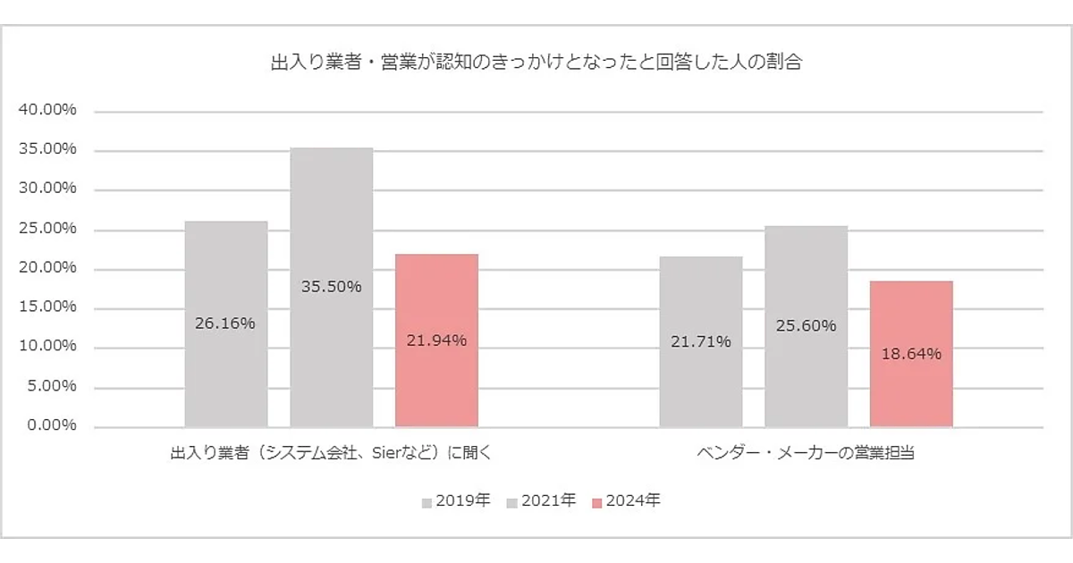 2019年・2021年・2024年の3年間について、認知のきっかけとして「出入り業者」「ベンダー・メーカーの営業担当」を挙げた人の割合を見ると、2021年が最も高く、2024年が最も低い結果になった。コロナ緩和で行動制限が解除されたことにより、以前から付き合いのある人からの情報収集割合は低下しているようだ。