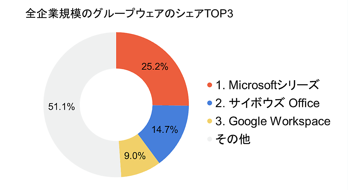 それによると、全企業規模における市場シェア上位は、「Microsoftシリーズ」25.21%、「サイボウズOffice」14.67%、「Google Workspace」9.0%だった。