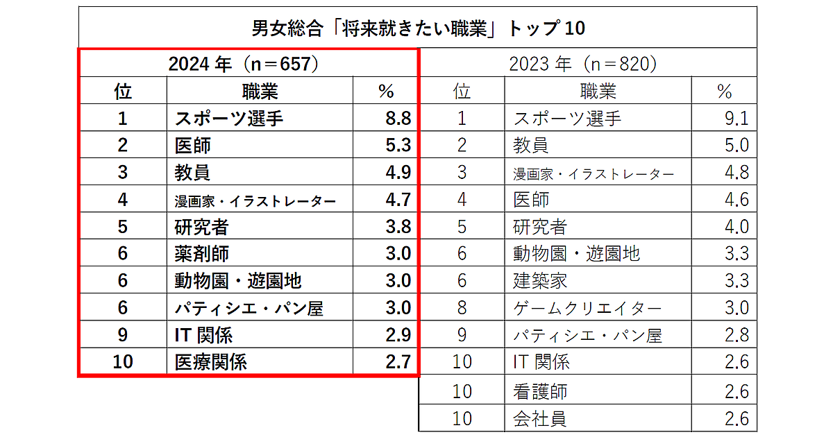 本調査によると、「将来就きたい職業」でトップとなったのは前年と同じく「スポーツ選手」だった。男女ともに医療職の人気が上昇しており、2位には前年4位の「医師」が教員を上回ってランクインした。