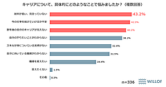 「自身のキャリアビジョンが見えていない理由」を聞くと、「自身のライフプラン(移住・留学・結婚・出産・子育て・介護等の予定・計画)が見えないから」28.7%が最多。この項目は男性に比べ女性の回答割合が多かった(男性23.8%、女性32.7%)。以下「先輩社員や上司を見て希望が持てないから」24.9%、「キャリアについて相談相手がいないから」22.1%などが続く。