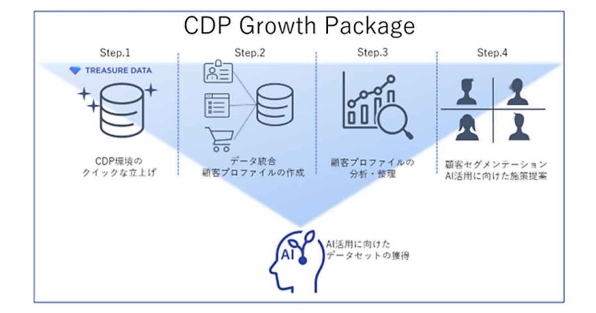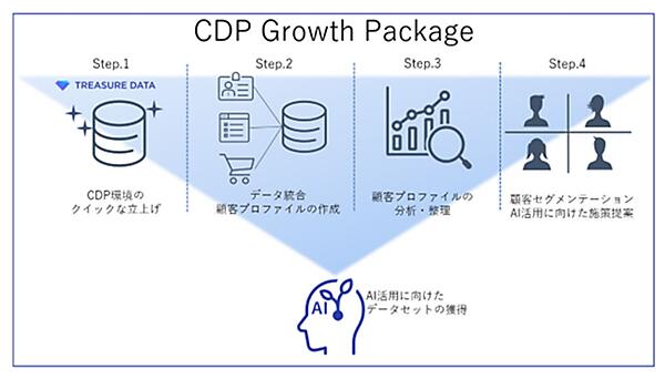 企業でAIの利活用が進む中、AIへのデータ供給基盤になるCDPの整備が急務となる一方、顧客データの統合や各部署に対応したデータ活用施策の整理などの課題があることから、CDP Growth Packageを提供する。CDP Growth PackageはAI利活用に関わるユースケースを限定し、Treasure Data CDPの導入期間を最大3分の1、コストを最大10分の1に抑える。