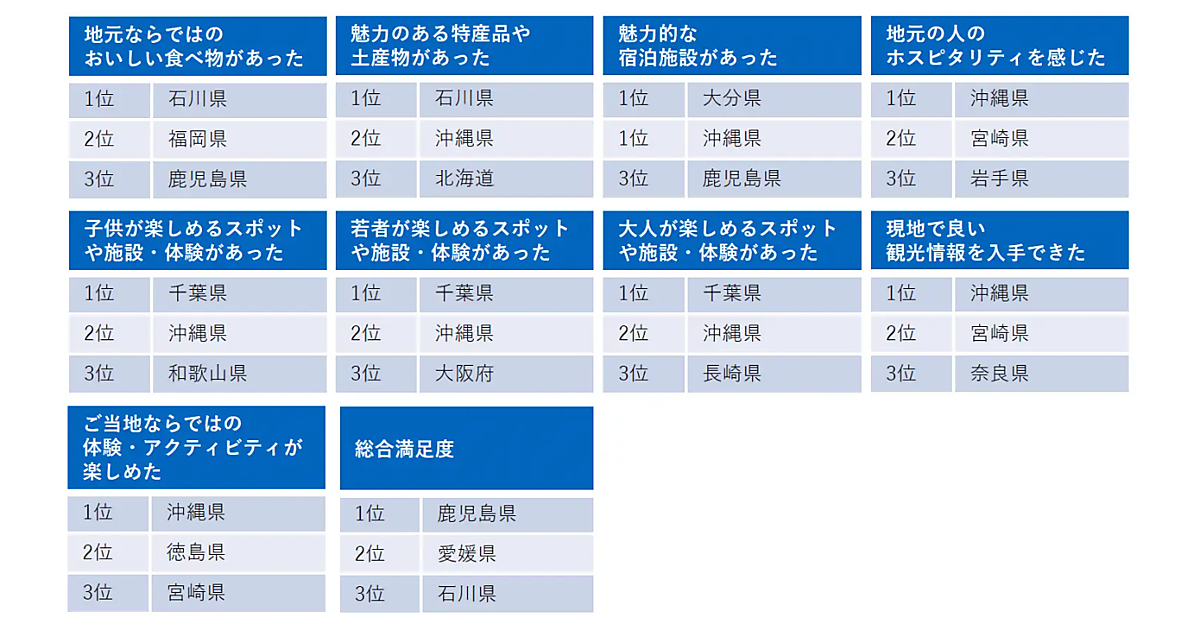 鹿児島県は「地元ならではのおいしい食べ物」「魅力的な宿泊施設」などテーマ別ランキングでも多くランクインしており、シニア層を中心に夫婦旅行などで人気が高いようだ。また、2024年1月には能登半島地震があった石川県も、「食」や「お土産」で首位を獲得。海外旅行が敬遠される中、首都圏や関西圏から飛行機で訪れることができるエリアが高い評価を得た。