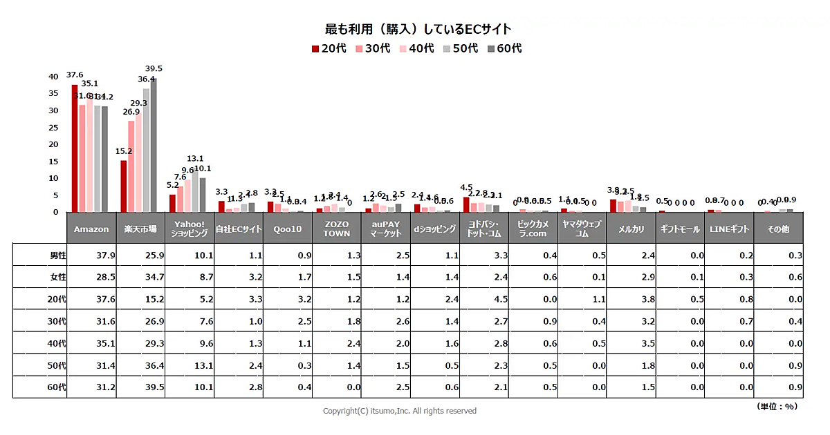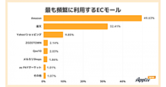 また、最も利用するECサイトとしては、「Amazon」と「楽天市場」に二極化している傾向だった。なお、20代のメイン利用は「Amazon」に偏っており、「楽天市場」とは倍以上の差をつけていた。一方で「楽天市場」は年代が上がるにつれメイン利用が高まっていた。