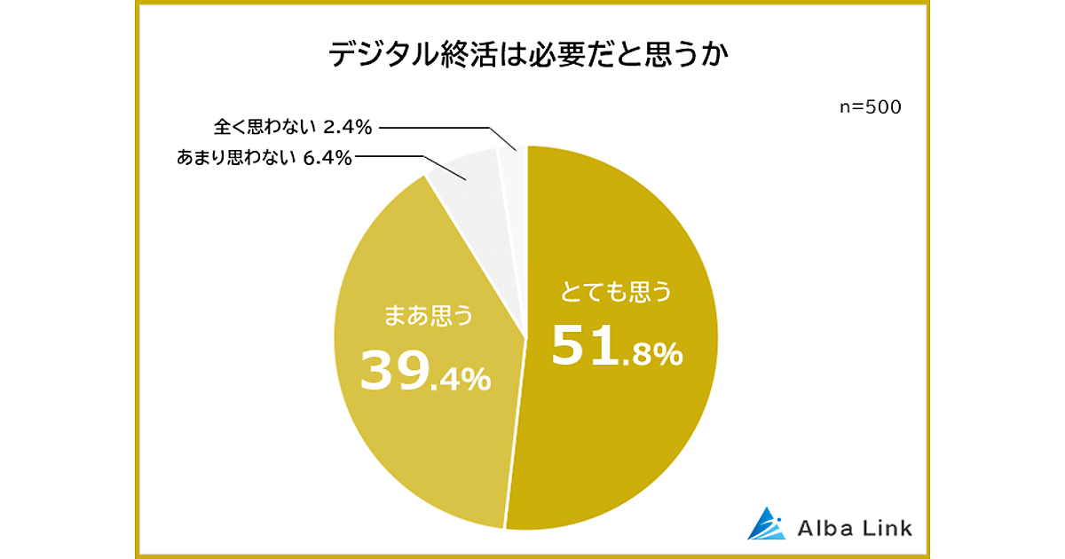 「訳あり物件買取プロ」を運営するAlbaLinkは、「デジタル終活に関する意識調査」を実施した。スマホやパソコンで管理されている情報やデータを生前に整理する「デジタル終活」について、20代以上の男女500名が回答している。