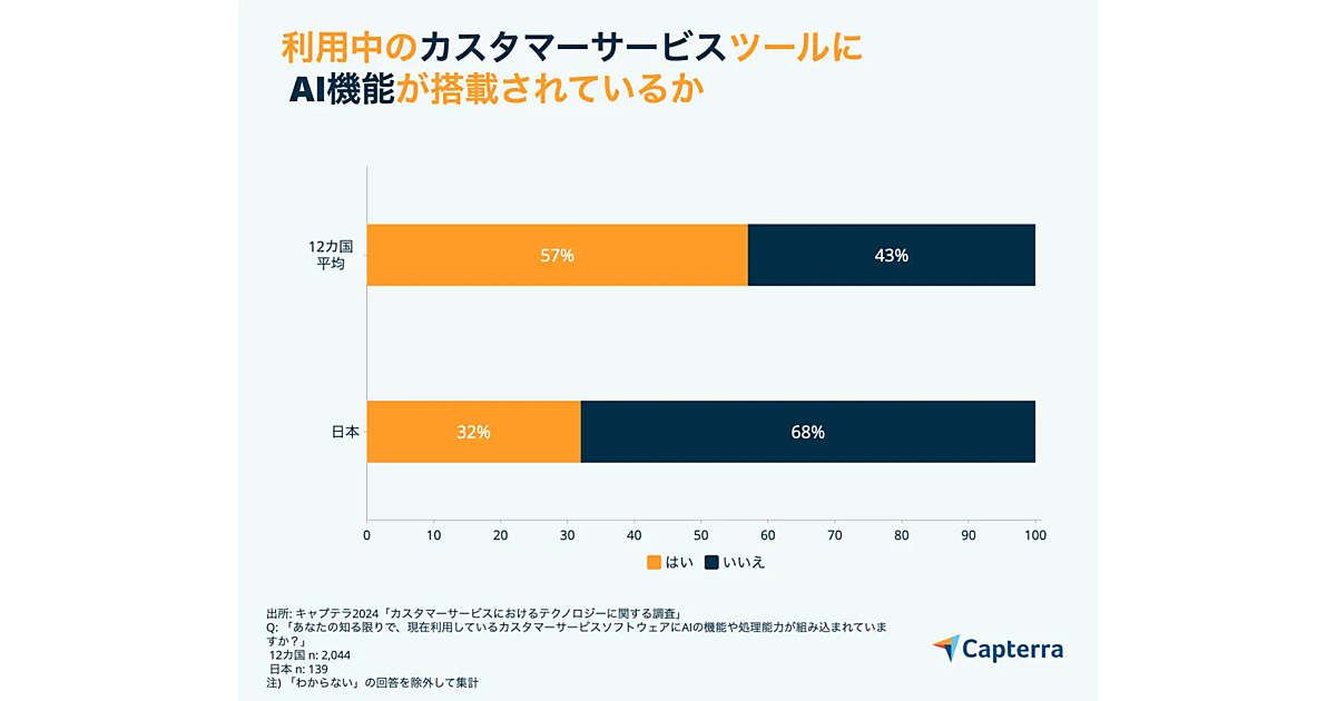 カスタマーサービスにおけるAI導入率:日本は32%、他国は57%