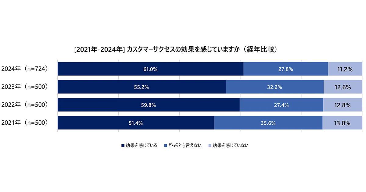 まず、カスタマーサクセス取り組みの効果について聞くと、2024年は前年より5.8ポイント増で61.0%の人が「効果を感じている」と回答した。これは直近3年間と比較して、最も高い割合となっている。