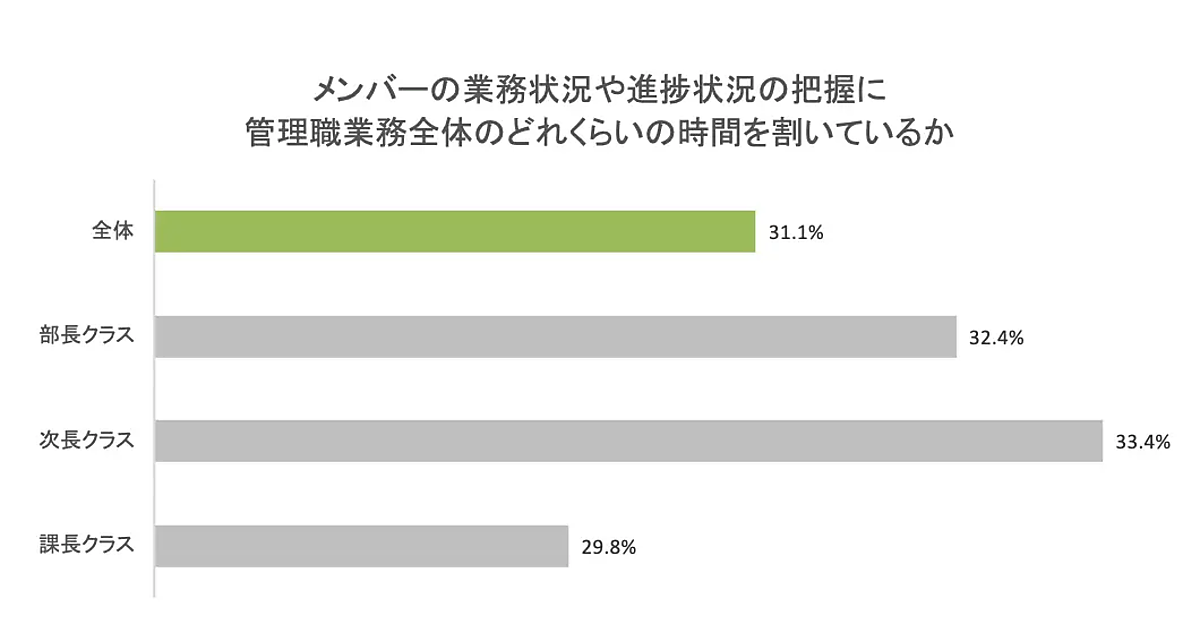 また、プレイング業務を除いた管理職としての業務のうち、「メンバーの業務状況や進捗状況の把握」にかけている割合を聞くと、全体の平均では31.1%という結果になった。