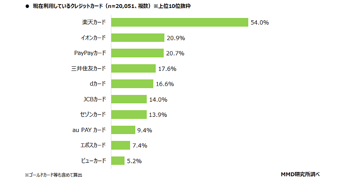 現在利用しているクレジットカードとしては、「楽天カード」が54.0%で、2位と倍以上の差をつけてトップとなった。以下「イオンカード」が20.9%、「PayPayカード」が20.7%と続いた。