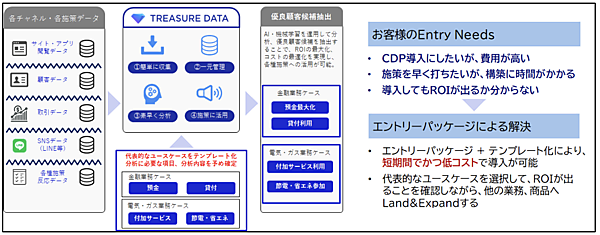 日本電気(NEC)とCDP(顧客データ基盤)事業のトレジャーデータは、ワンストップで顧客データの統合と活用を実現する提供中の「NECカスタマーインサイトサービス」で、新たに「エントリーパッケージ」を共同開発して7月31日から提供を始めたと発表した。主要なユースケースをテンプレート化した。顧客データ活用サービス「Treasure Data CDP」上に実装したサービスを金融機関向けのテンプレートから順次提供していく。