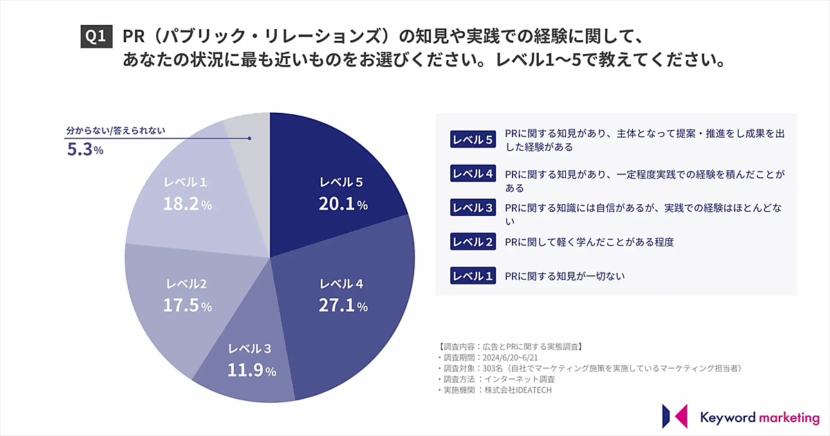 まず、PR(パブリック・リレーションズ)の知見や実践での経験について、現在の状況に最も近いものを5段階で聞くと、「実践経験がある(レベル4・5)」と回答した人は全体の47.2%にのぼった。