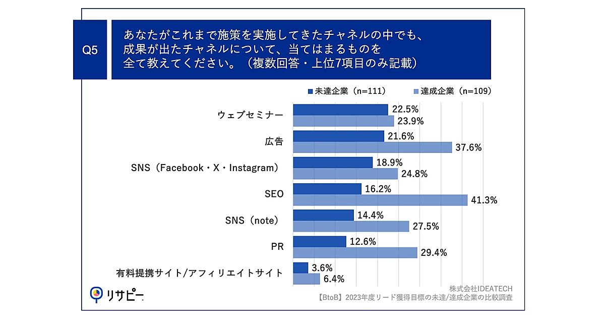 これまで施策を実施してきたチャネルの中で、特に成果が出たチャネルはどれかを聞くと、未達企業では「ウェブセミナー」が22.5%で最も多かったのに対し、達成企業では「SEO」が41.3%となり、未達企業よりも25.1ポイント高い結果となった。