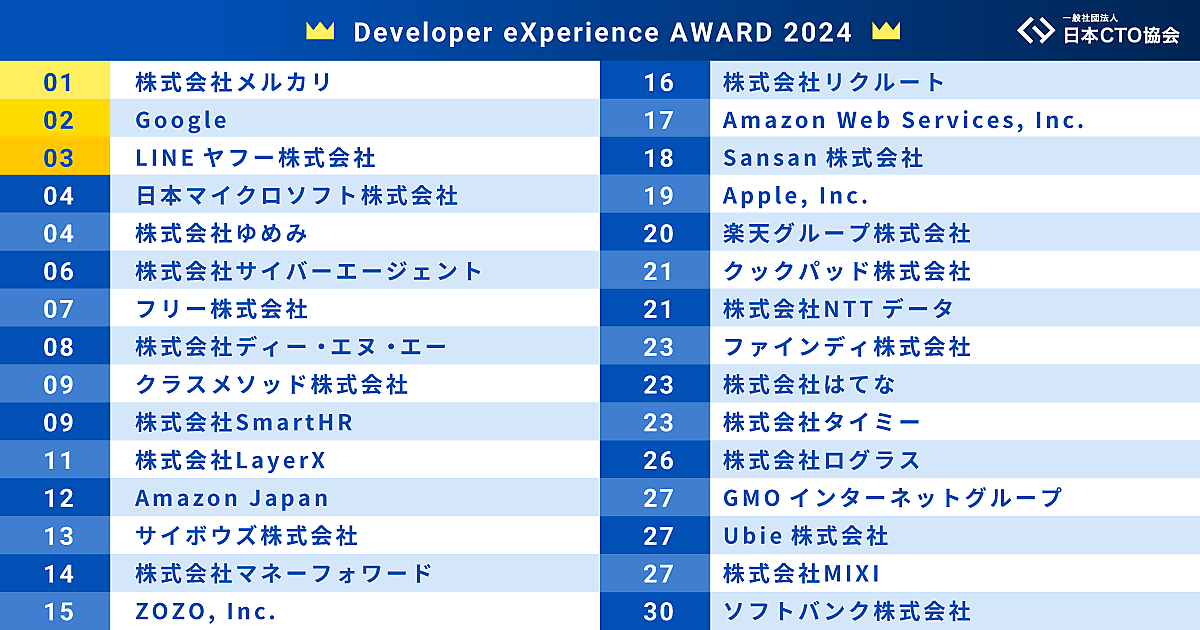 それによると、「Developer eXperience AWARD 2024」ランキング1位は「メルカリ」、以下「Google」、「LINEヤフー」が続いた。