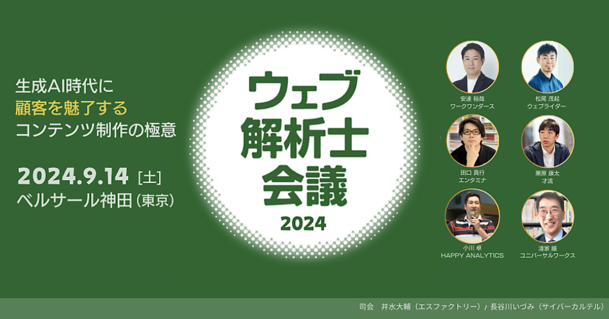 一般社団法人ウェブ解析士協会は生成AI時代に顧客を魅了するコンテンツ制作の極意をテーマに「ウェブ解析士会議2024」を、2024年9月14日(土)にベルサール神田で開催する。