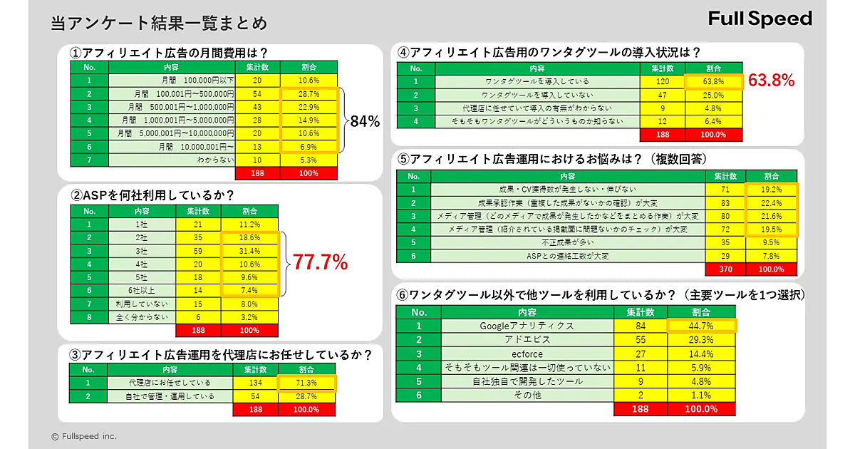 フルスピードは、ASP(アフィリエイトサービスプロバイダー)利用数とワンタグツール利用率についての実態調査を実施した。アフィリエイト広告運用に取り組んでいる企業のマーケティング担当者188名が回答している。