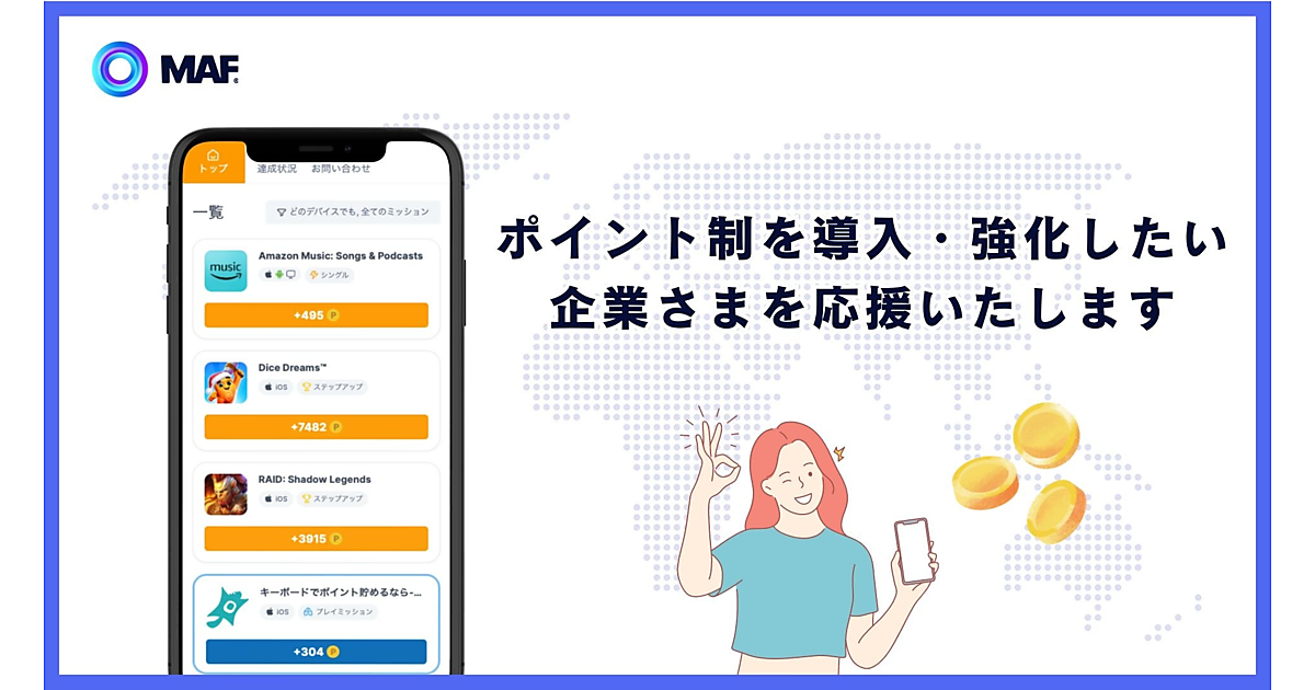 イタリアの広告技術企業、MAFは、日本法人のMAF Japanを7月末に設立した、と8月9日発表した。広告案件を通して自社のユーザーにポイントが付与できる導入型広告チャンネル(オファーウォール)「MyChips」の事業を展開する。日本でのポイント活用(ポイ活)市場の拡大や、ポイントサービスの競争激化を受け、新たなリワード広告を提案する。