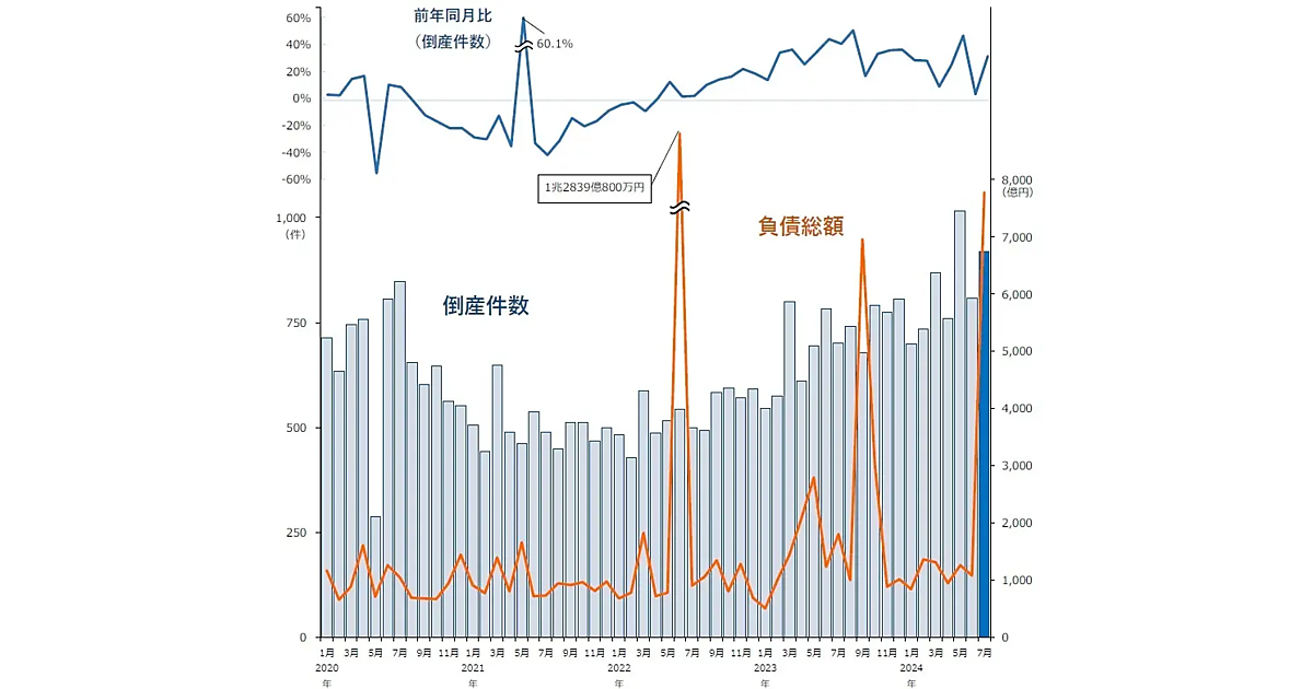 2024年7月の倒産件数は920件、負債総額は約7769億円