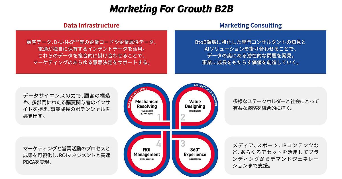 BtoBのマーケティングは、企業の意思決定者や購買担当者の行動データ分析に基づく購買意向や関心の理解が重要となり、適切なマーケティング戦略の策定・実行には業界特有の課題解決への知見が求められることから、Marketing For Growth B2Bを展開する。ウェブ上で顧客が意図を持って起こした行動データのインテントデータやAI(人工知能)を活用する。