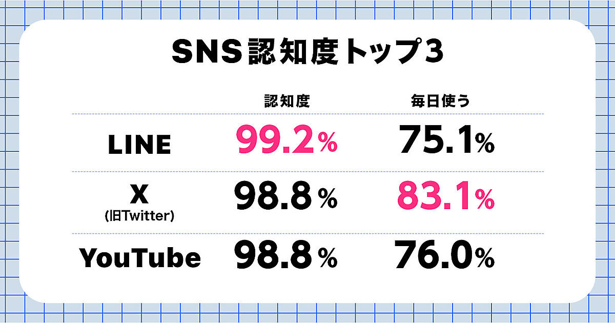 まず「各サービスの認知度」を聞くと、「LINE」99.2%、「X(旧Twitter)」「YouTube」各98.8%が上位。利用頻度では「X(旧Twitter)」83.1%が特に高かった。