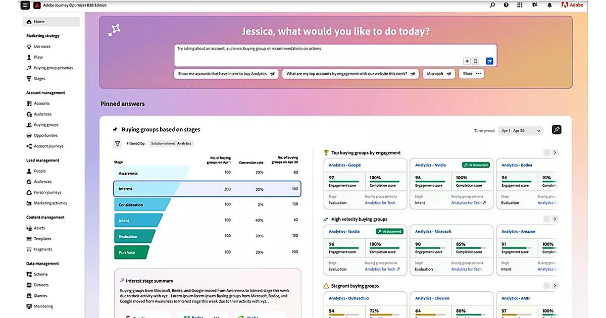 AJO B2B Editionは、さまざまなチャネルの顧客を単一のビューで表示し、生成AIで購買グループを特定。パーソナライズされた顧客体験を創出する。主な機能は①購買グループの作成と編成②パーソナライズされたカスタマージャーニーの設計③パーソナライズされたコンテンツの生成④営業とマーケティングの連携強化⑤パフォーマンスの測定と最適化--。