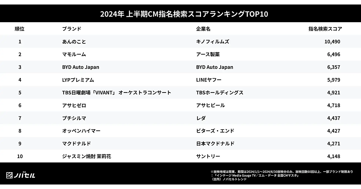 ノバセルは、テレビCM効果の分析サービス「ノバセル トレンド」を活用し、2024年上半期に放映されたテレビCMの指名検索スコアランキングを発表した。CM放映の前後数分間に増えた指名検索数をCMの放映量で割ったスコアを「指名検索スコア」と設定している。