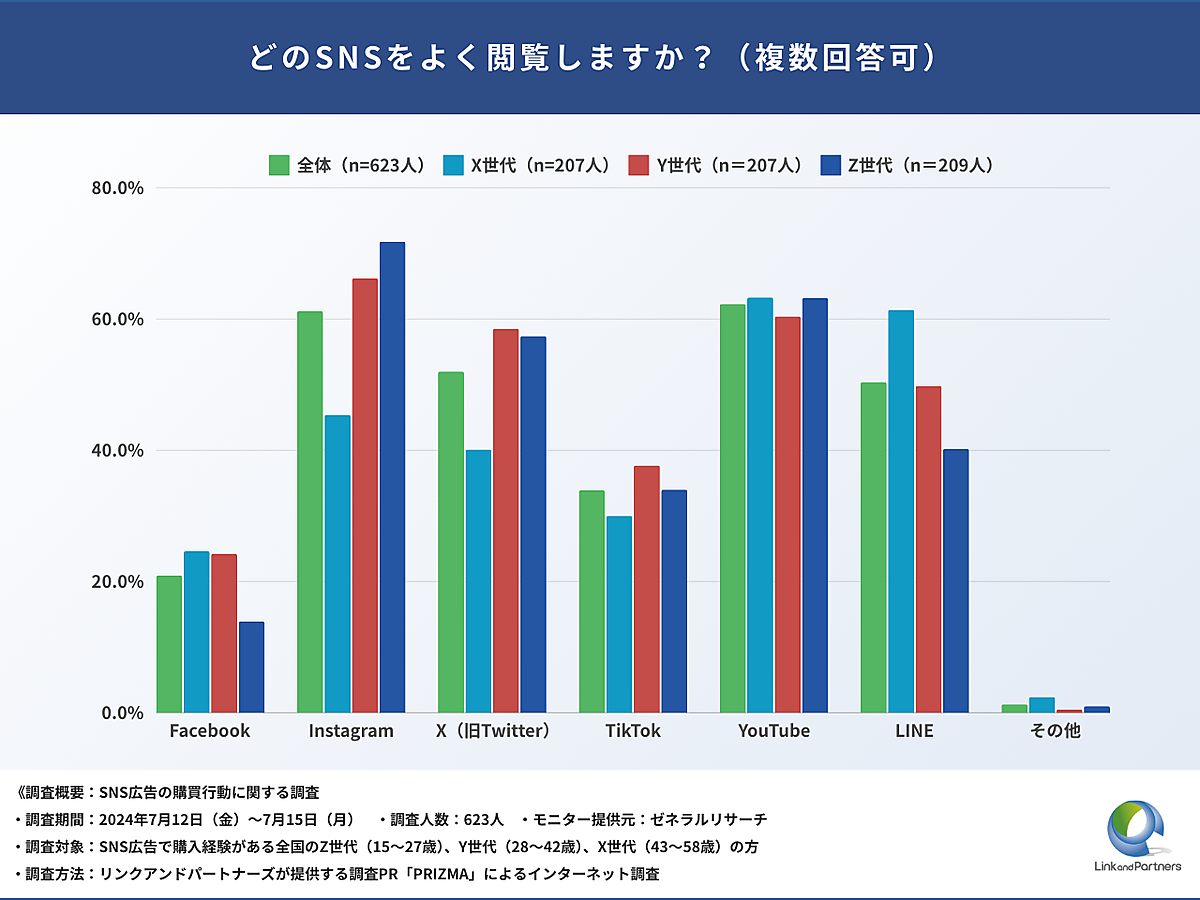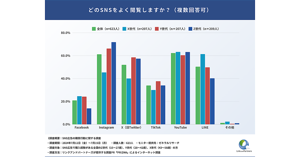 リンクアンドパートナーズは、「SNS広告の購買行動」に関する調査結果を発表した。SNS広告で購入経験がある全国のZ世代(15~27歳)、Y世代(28~42歳)、X世代(43~58歳)623人が、よく閲覧しているSNS、つい見てしまう広告の形式、SNS広告を閲覧する際にもっとも魅かれるポイント、SNS広告で避けたくなる要素などについて-回答している。