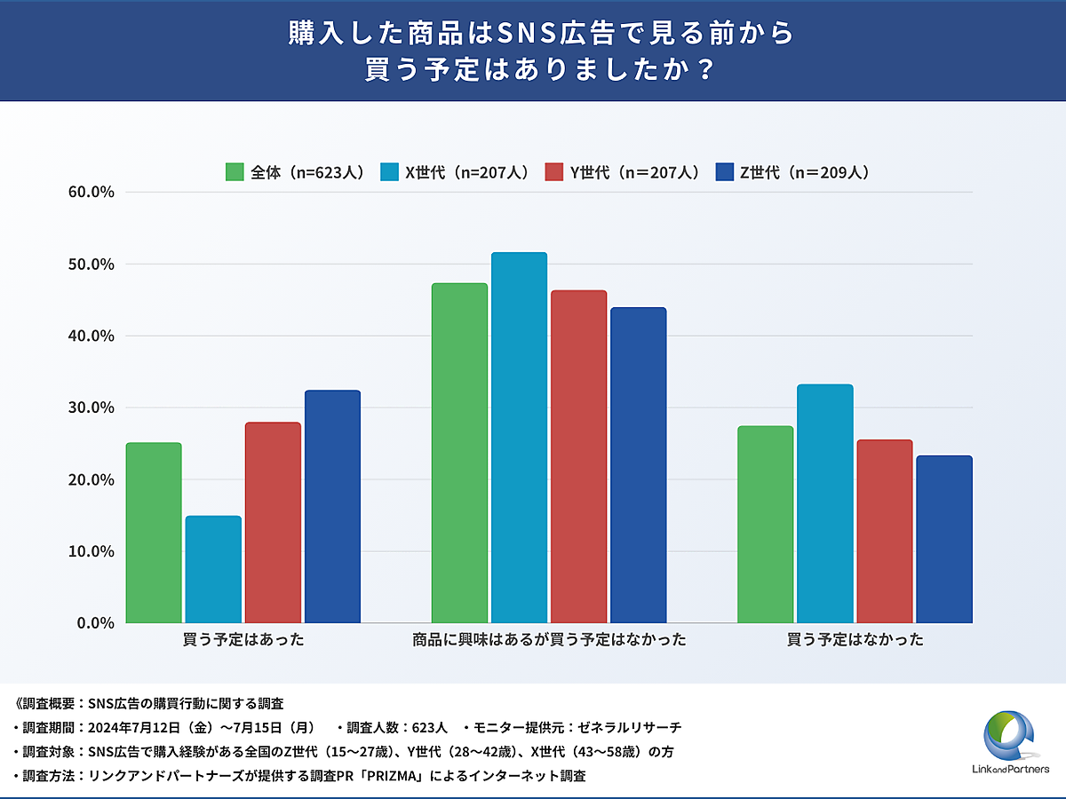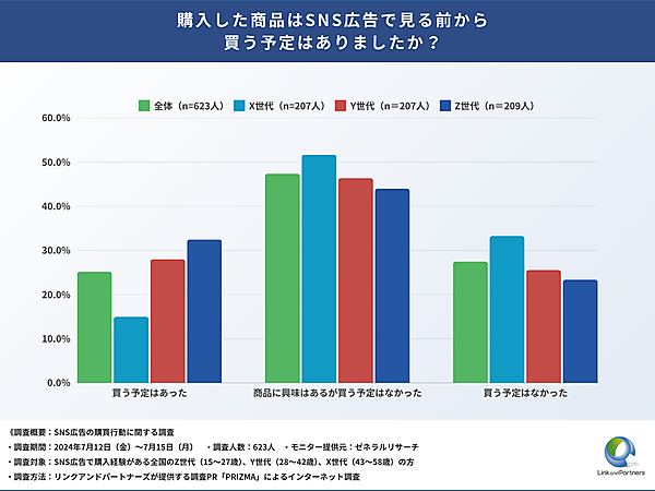 さらに「購入した商品はSNS広告で見る前から買う予定はありましたか?」と聞くと、「買う予定はあった」25.2%を「商品に興味はあるが買う予定はなかった」47.6%、「買う予定はなかった」27.5%と、計75.1%がもともとの予定はなかったとした。世代別では若い世代ほど「買う予定はあった」が多い傾向が見られた。
