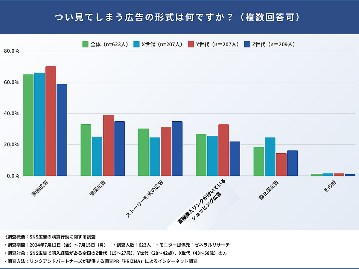 次に「つい見てしまうSNS広告の形式」を聞くと、上位は「動画広告」65.0%、「漫画広告」33.1%、「ストーリー形式の広告」30.3%だった。世代別でも「動画広告」は全世代でトップだが、2位はX世代だと「直接購入リンクが付いているショッピング広告」25.6%、Y世代とZ世代は「漫画広告」となり、ここでもX世代とY世代・Z世代との差異が見られた。