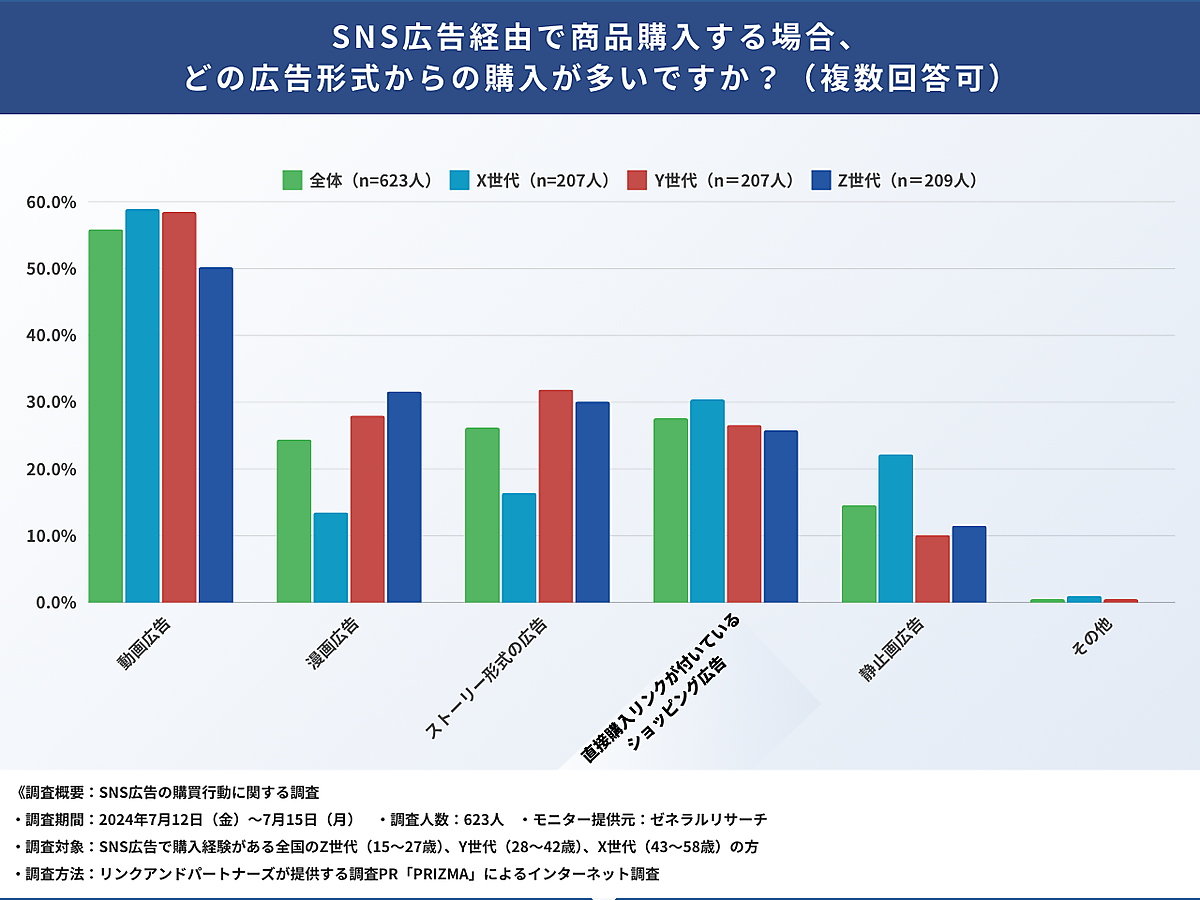 「SNS広告経由で商品購入する場合、どの広告形式からの購入が多いですか?」という質問でも、トップは「動画広告」55.9%。以下「直接購入リンクが付いているショッピング広告」27.6%、「ストーリー形式の広告」26.2%が続く。世代の傾向差も「つい見てしまう広告の形式」とほぼ同じだ。