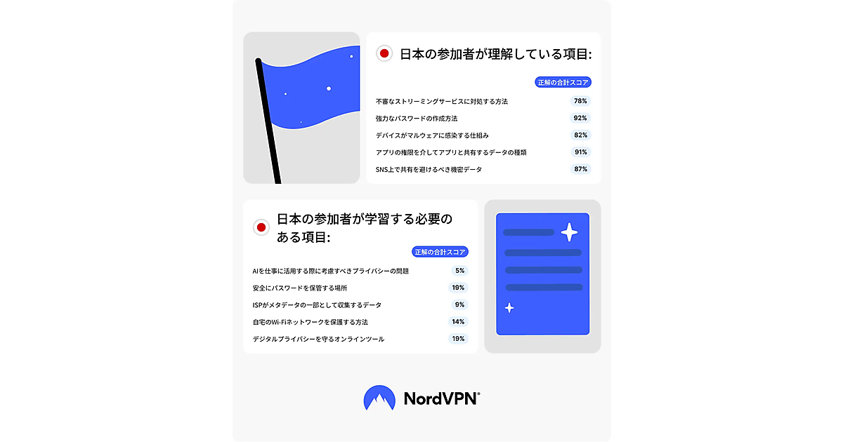調査によると、サイバーセキュリティとインターネットプライバシーの知識に関する世界ランキングで、日本は9位から12位に後退し、韓国と並び世界最下位となった。強力なパスワードの作成方法等には詳しい一方で、仕事でAIを使用する際のプライバシー問題には苦戦しているようだった。