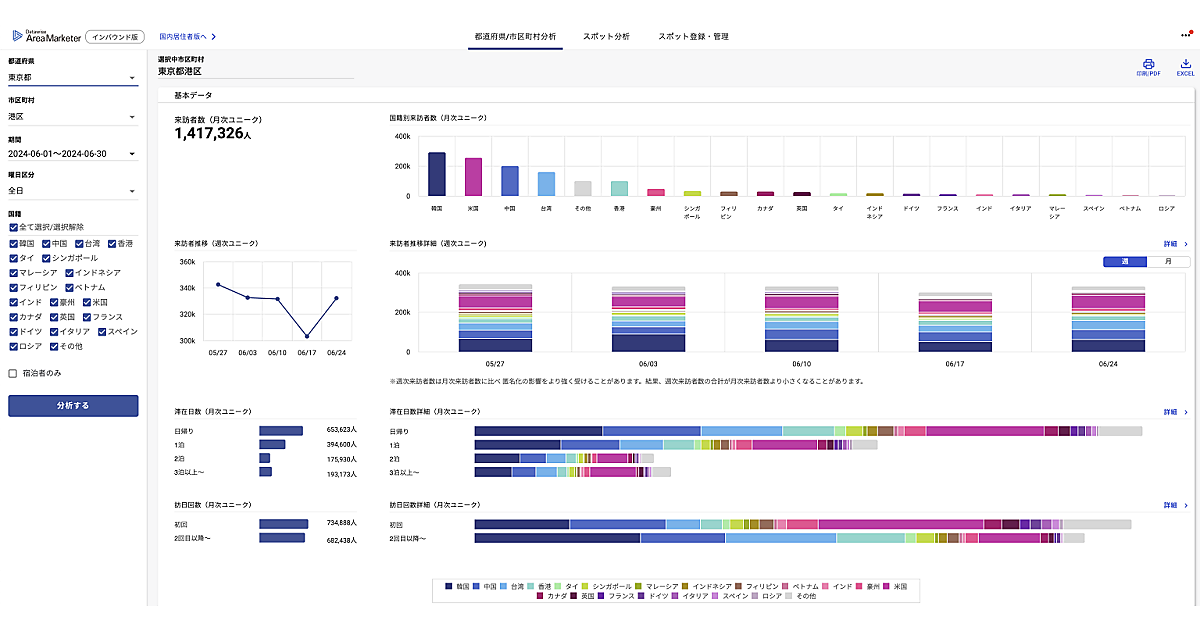 インバウンドは2023年1~12月実績で2500万人、24年6月時点で1700万人超となり過去最高だった19年同期を100万人以上も上回っている。NTTドコモのGPS統計データを用いた人流分析サービスを自治体や流通小売企業に提供してきたが、「インバウンド観光・インバウンド需要を分析したい」「見やすいUIでインバウンド人流分析を提供してほしい」と強く要望されたため、Datawise Area Marketerインバウンド版の提供を決めた。