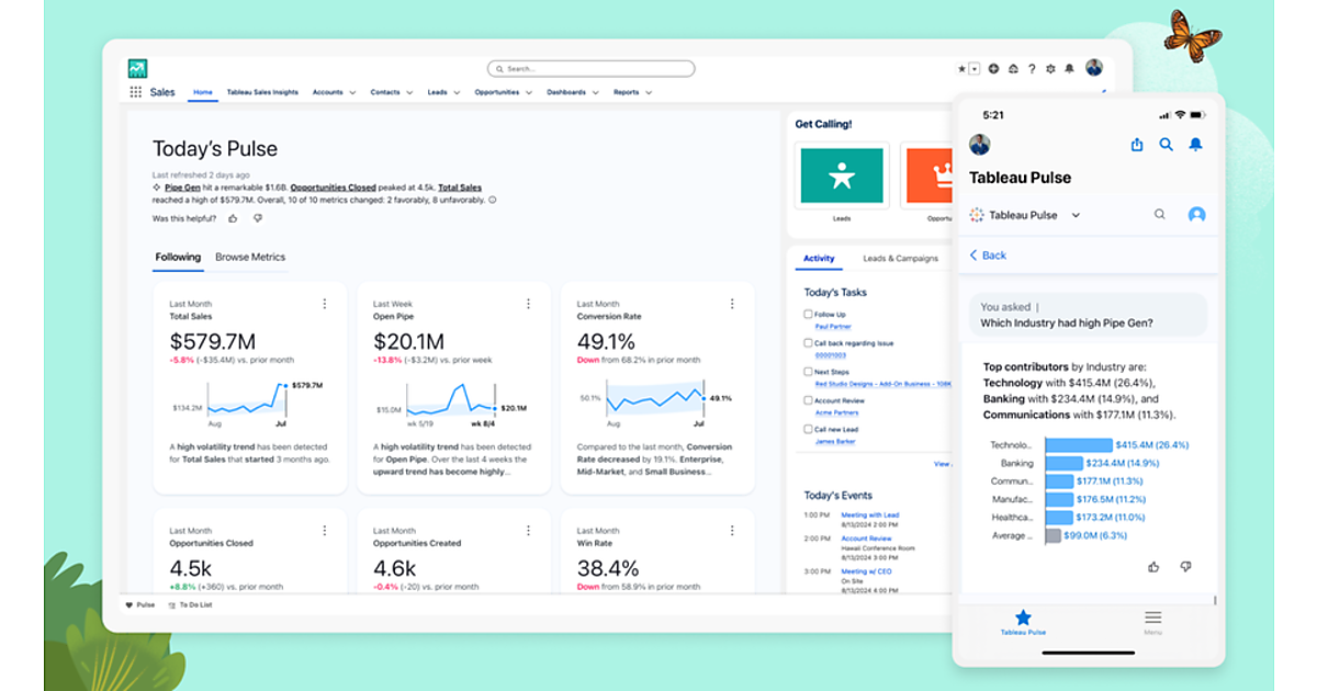 2月に発表されたTableau Pulseは、ビジネスユーザーが関心を持つ指標やトレンド、貢献要因、異常値を自動的に検出し、生成AIを活用して分析結果をわかりやすい言葉で表示する。例えば、営業リーダーに担当者の業績低下を自然言語とシンプルなビジュアルで事前に警告する。Pulse for Salesforceは、こうしたTableau Pulseの強力な機能をSalesforceアプリケーションに直接統合した。