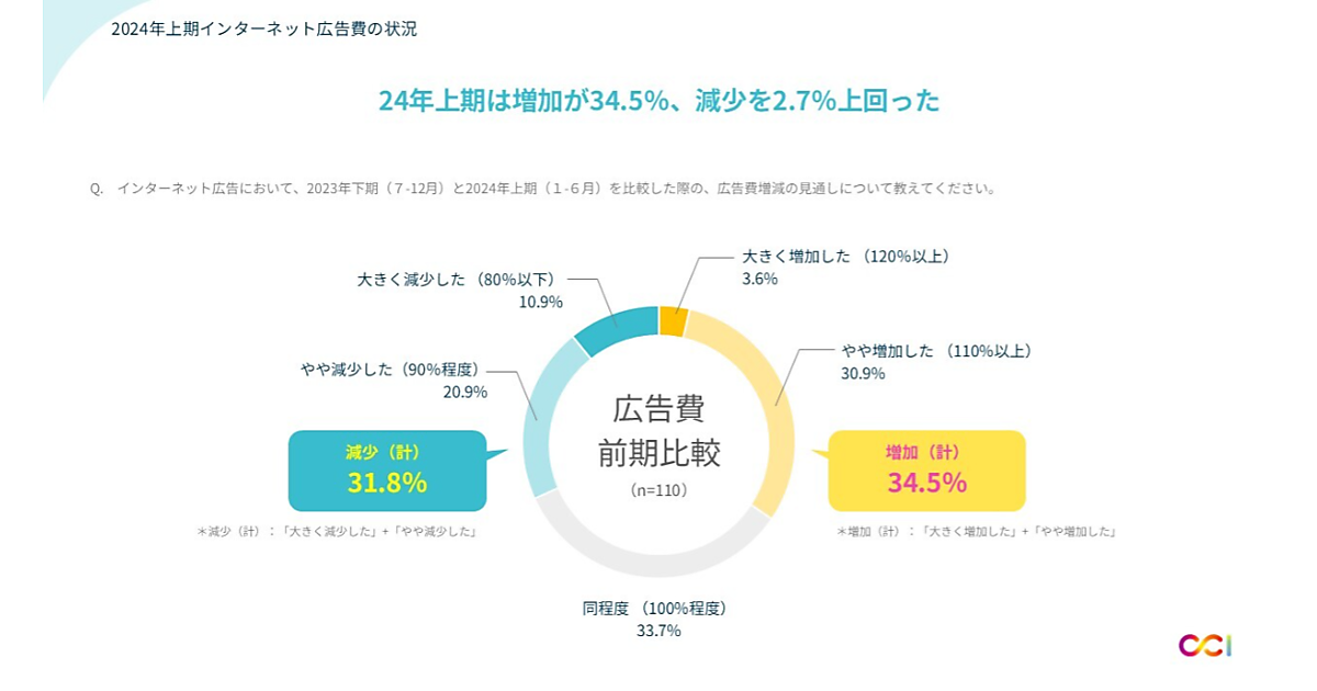 まず、2024年上期のインターネット広告費について、2023年下期と比べたところ、34.5%の人が「増加した」と回答した。特に「やや増加(下期比110%以上)」は30.9%にのぼっており、「減少」は31.8%、「同程度」は33.7%となった。