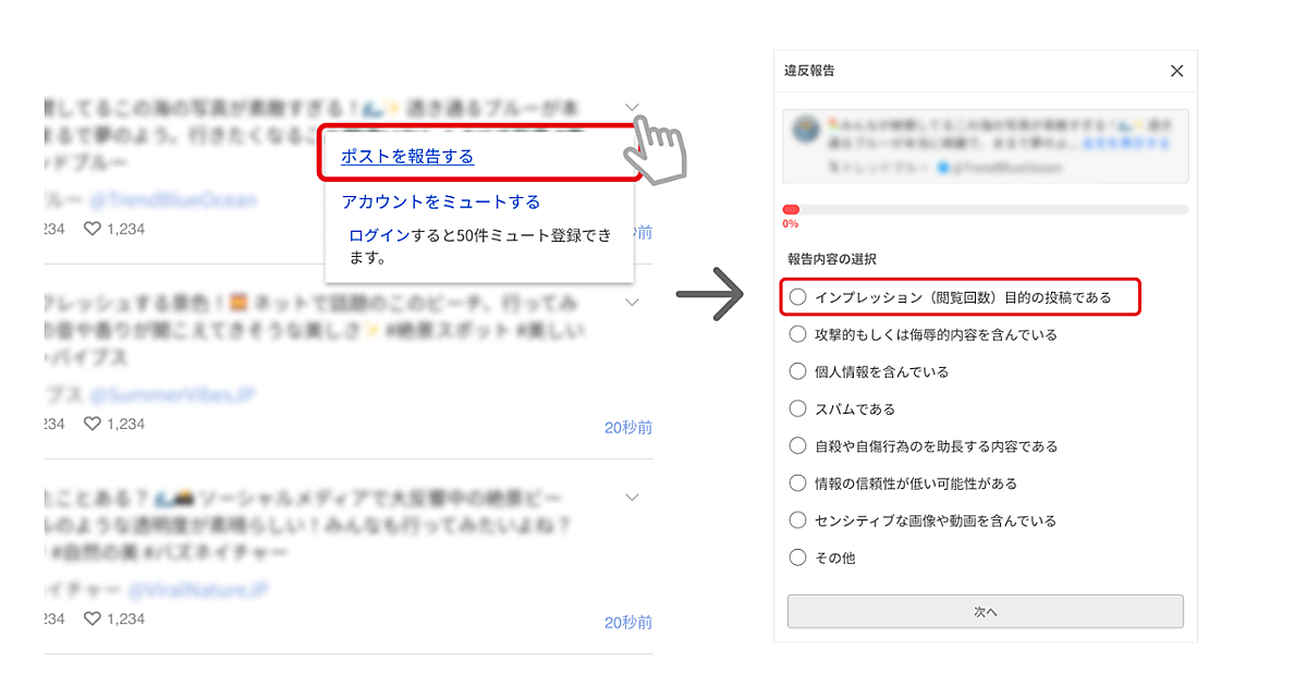ユーザーがこれらの投稿を報告できるようにするため、違反報告機能「ポストを報告する」の選択項目に「インプレッション(閲覧回数)目的の投稿である」という項目を追加した。不自然な投稿の増加によって、情報収集の際に有用なポストや、人々のリアルな意見・主張のポストが埋もれて見つけづらいなど、「Yahoo!リアルタイム検索」のユーザーに好ましくない体験を提供してしまうケースが発生していた。