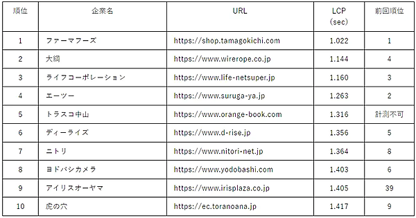 調査によると、2024年のECサイトの表示速度ランキング1位は「ファーマフーズ」で、LCPは1.022秒。2位は「大綱」で、前回の4位から2つ順位を上げた。3位は昨年に引き続き「ライフコーポレーション」がランクイン。また、「アイリスオーヤマ」は39位→9位へと大幅に順位を上げ、ウェブサイトパフォーマンスを大きく改善した。なお、今回の調査では、100サイト中75サイトがLCP2.5秒以内を達成している。