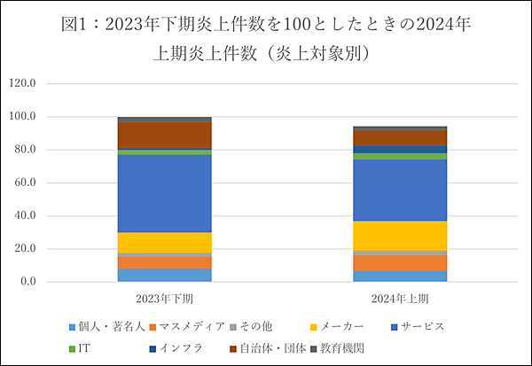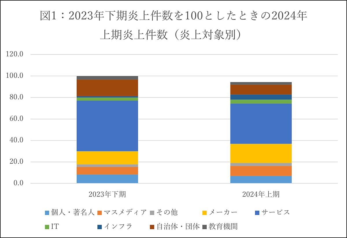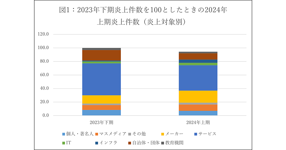 2024年上期(2024年1月~6月)のネット炎上件数は、2023年下期(2023年7月~12月)から5.6%減少。業種別では「メーカー企業」の炎上が増加している。一方「サービス企業」「自治体・団体」の炎上は減少した。なお絶対数は減少したが、「サービス企業」の炎上は6か月間平均で全体の40%を占める。