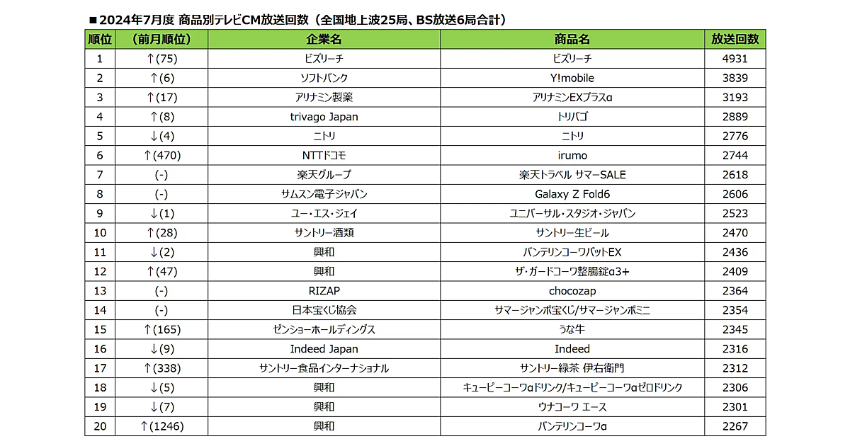 調査によると、2024年7月のテレビCM放送回数ランキング1位はビズリーチの「ビズリーチ」で、前月75位からの急上昇となった。2位はソフトバンクの「Y!mobile」、3位はアリナミン製薬の「アリナミンEXプラスα」と続いている。