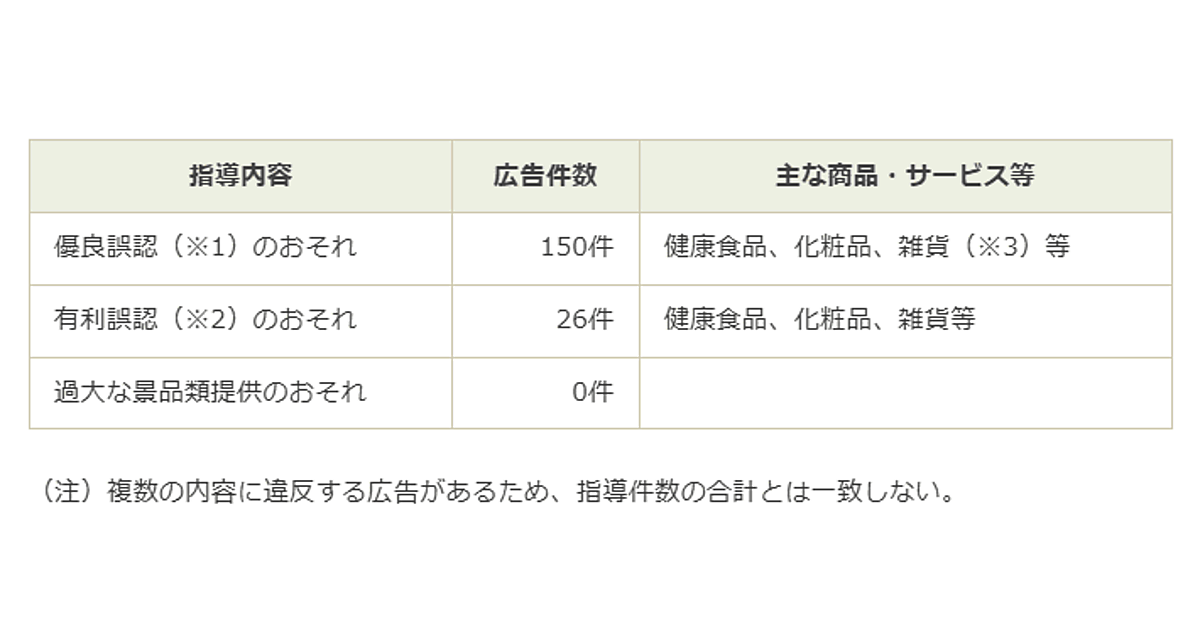 それによると2023年度は、16,000件のインターネット広告を監視し、153事業者(156件の広告)に対し改善指導を行ったとのこと。156件のうち、「優良誤認のおそれ(品質、規格の誤認)」にあたるものが150件、「有利誤認のおそれ(価格の誤認)」が26件だった(違反の重複あり)。
