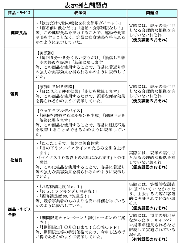 具体的には、「飲むだけで効くといった表示」「薬や医療行為のような効果を表示」「事実に基づかない“期間限定”“No.1”といった表示」など、誇大な効果をうたう広告が健康食品や化粧品に多く見られた。