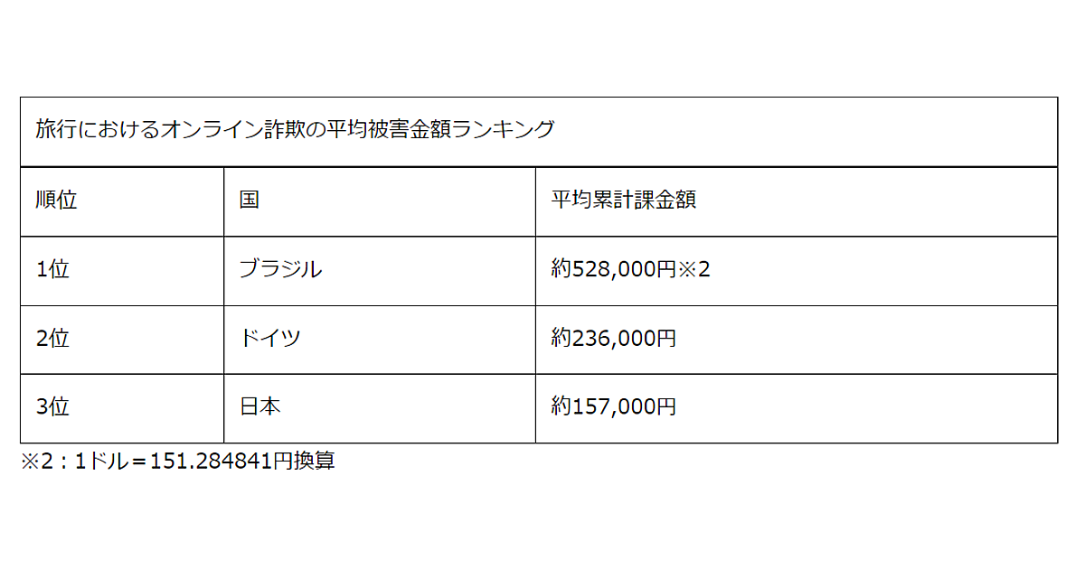 その一方で、「旅行中におけるオンライン詐欺の平均被害金額」をランキングでみると、日本は1位のブラジル、2位のドイツに続き、平均15万6580円で世界3位となった。