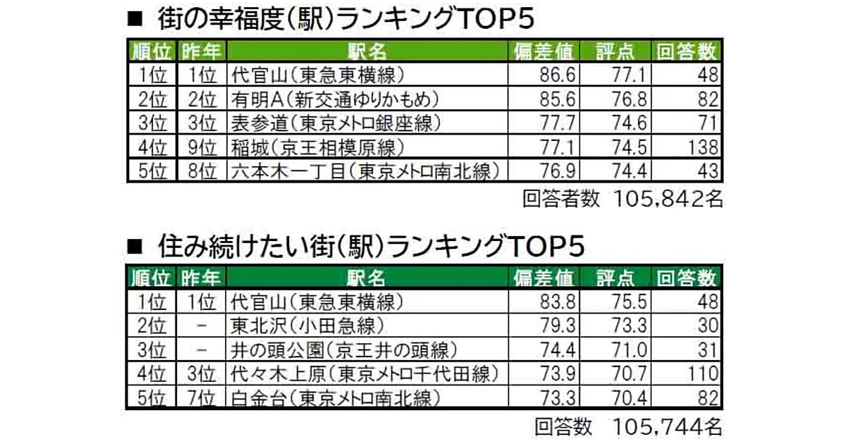東京の駅の幸福度ランキング、「代官山」が3年連続の1位