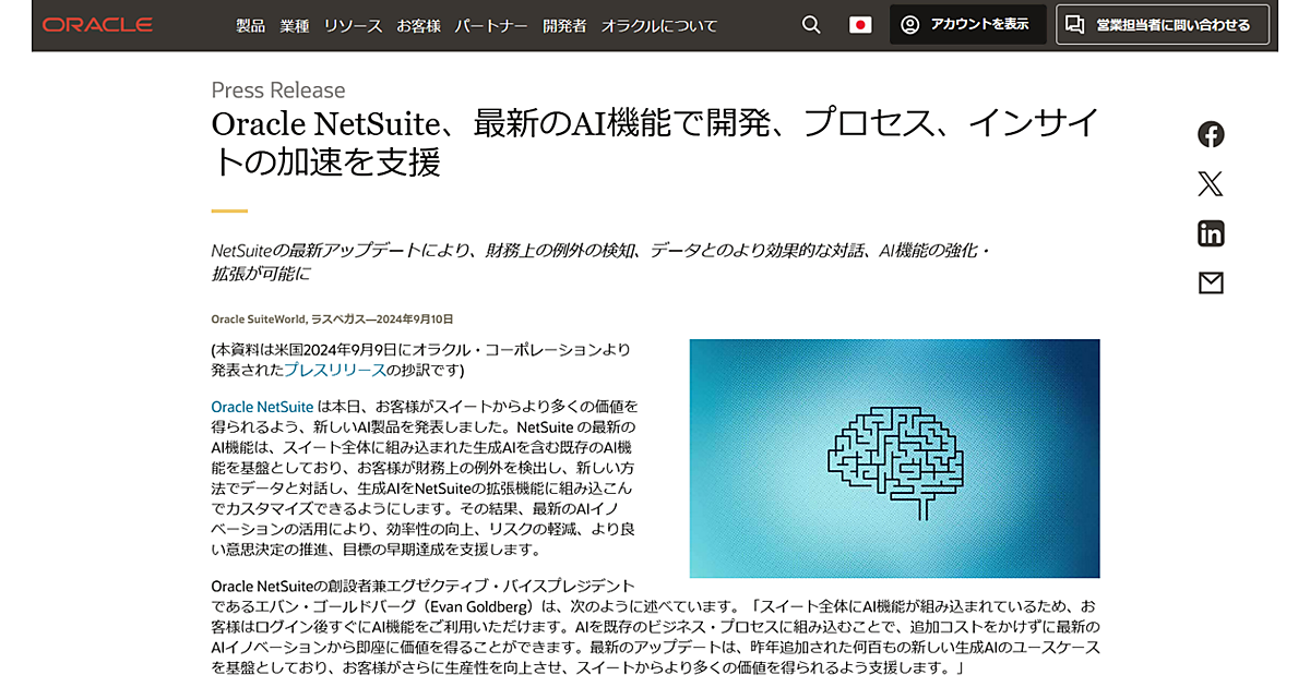 Oracle NetSuiteは、ERP(企業資源計画)、財務会計、CRM(顧客関係管理)、Eコマースを統合したビジネスアプリケーション。全体にAIが組み込まれているため、ユーザーはログイン後すぐにAI機能を利用でき、追加費用不要で最新のAIの活用が可能になる。今回、昨年加えた何百にも及ぶ新たな生成AIのユースケースを基盤に、アップデートを実施する。