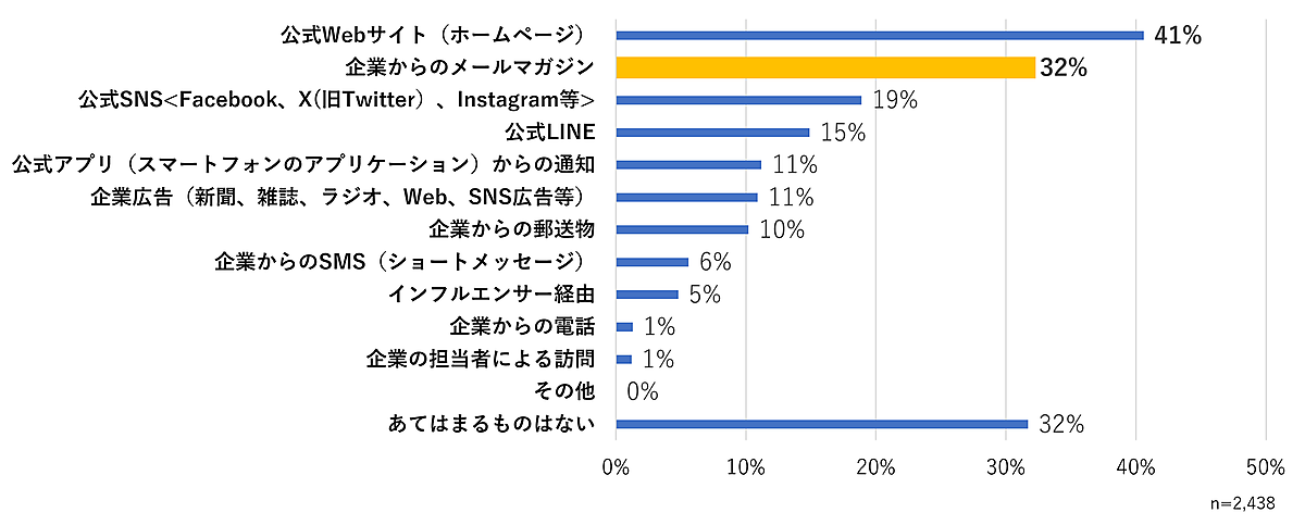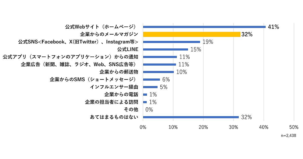 まず同社が2024年3月28日~4月1日した調査では「企業(サービス・ブランドを含む)の情報を受け取りたい手段」については、「公式Webサイト」41%に次いで「企業からのメールマガジン」32%が多かった。なお「プライベートで企業(サービス・ブランドを含む)からのメールマガジンを受信しているか」と聞くと「受信している」は46%だった。