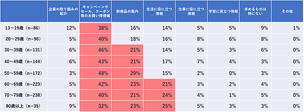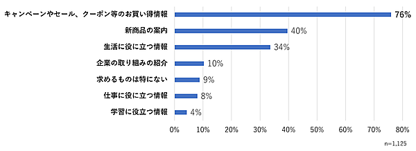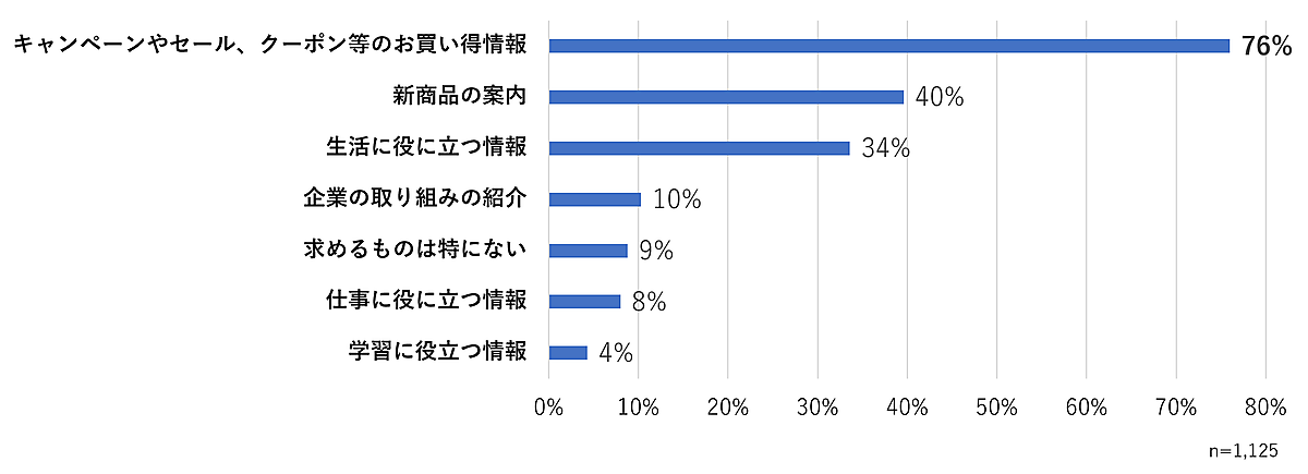 メールマガジンに求めるものを聞くと、「キャンペーンやセール、クーポン等のお買い得情報」76%が圧倒的に多い。年代別でもこの傾向は変わらないが、特に30代(46%)や50代(48%)の層で顕著である。