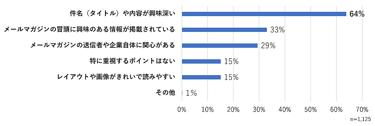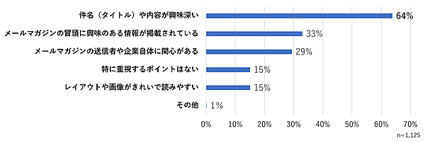 「メールマガジンを読みたくなるポイント」を聞くと、「件名(タイトル)や内容が興味深い」64%が最多。2位「メルマガの冒頭に興味のある情報が掲載されている」33%のほぼ倍である。