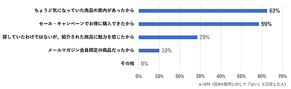 「あなたはこれまでにメールマガジン経由で商品・サービスを購入・申し込みしたことはあるか」を聞くと、51%が「はい」を選択。その理由を聞くと、「ちょうど気になっていた商品の案内があったから」63%、「セール・キャンペーンでお得に購入できたから」などが上位だった。